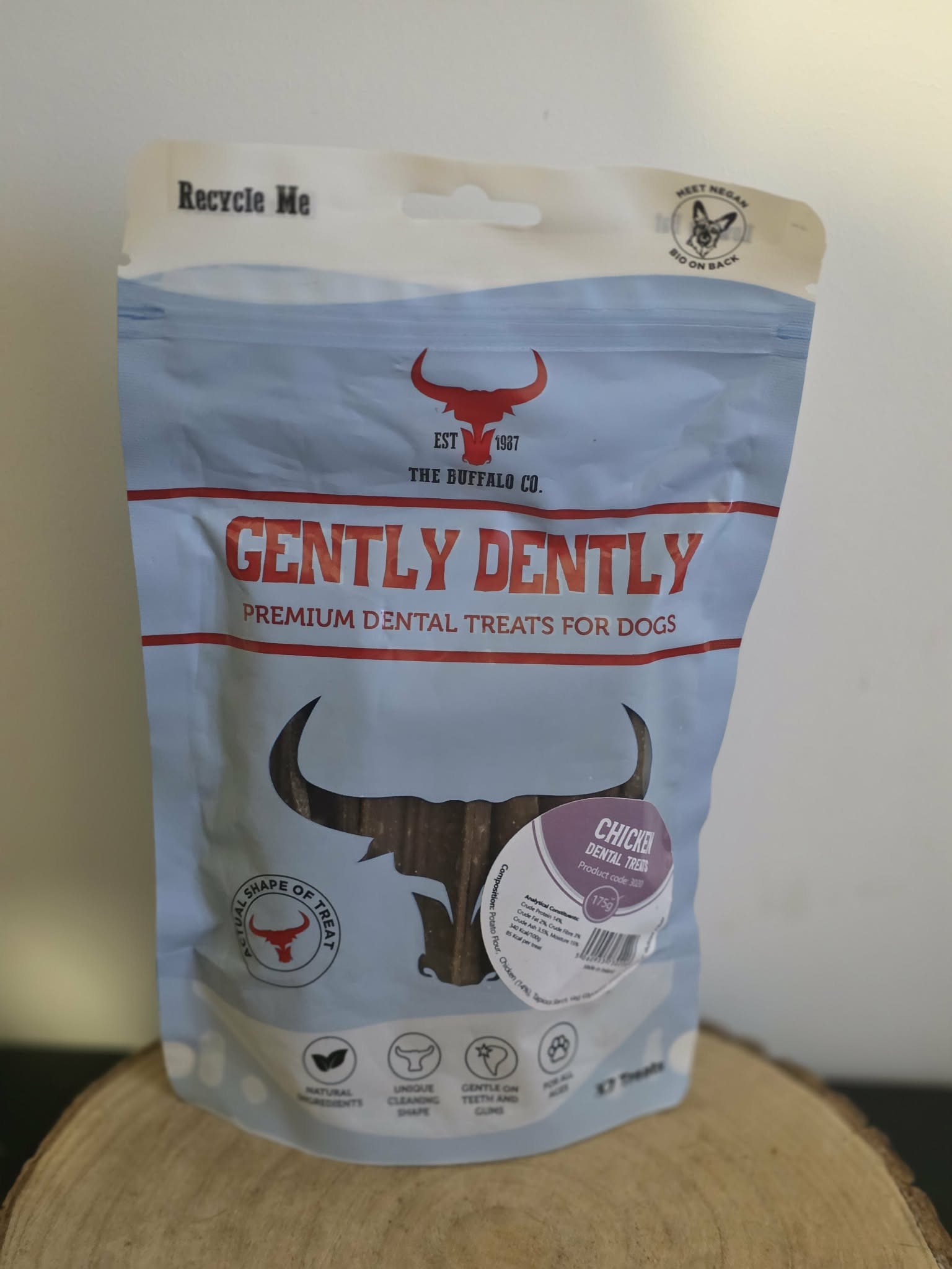 Gently Dently treats made with real Chicken are 100% natural and made with human grade ingredients. The unique Buffalo head shape helps massage gums and cleans tartar whilst remaining gentle on the gums.